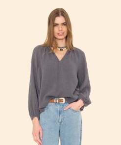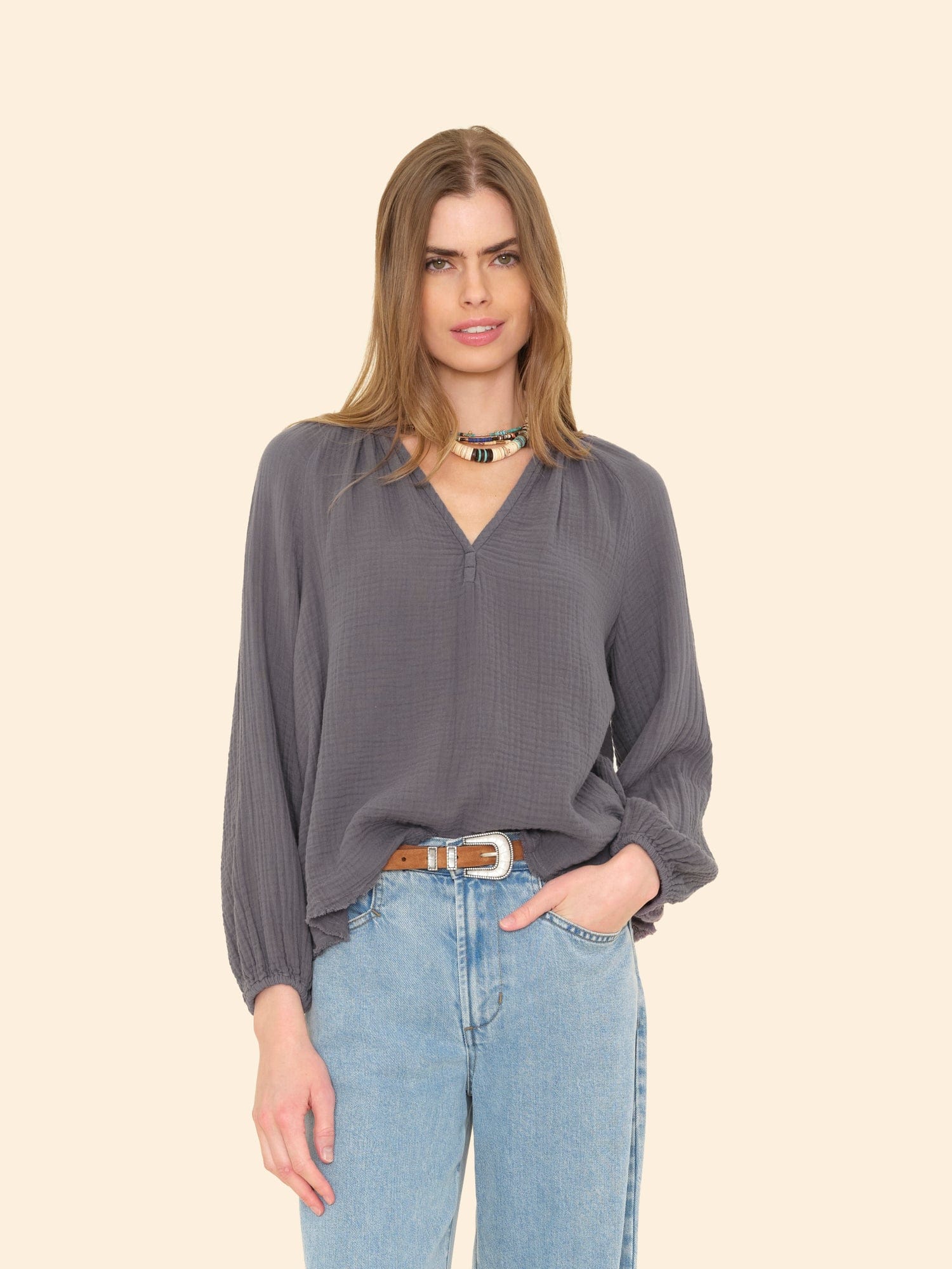 Pretty Please. Milla is new this season in our washed double faced cotton gauze for a soft, gently crinkled feel. This easy pullover top features a raw edge V-neck and bottom hem, and blouson sleeves.