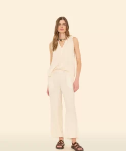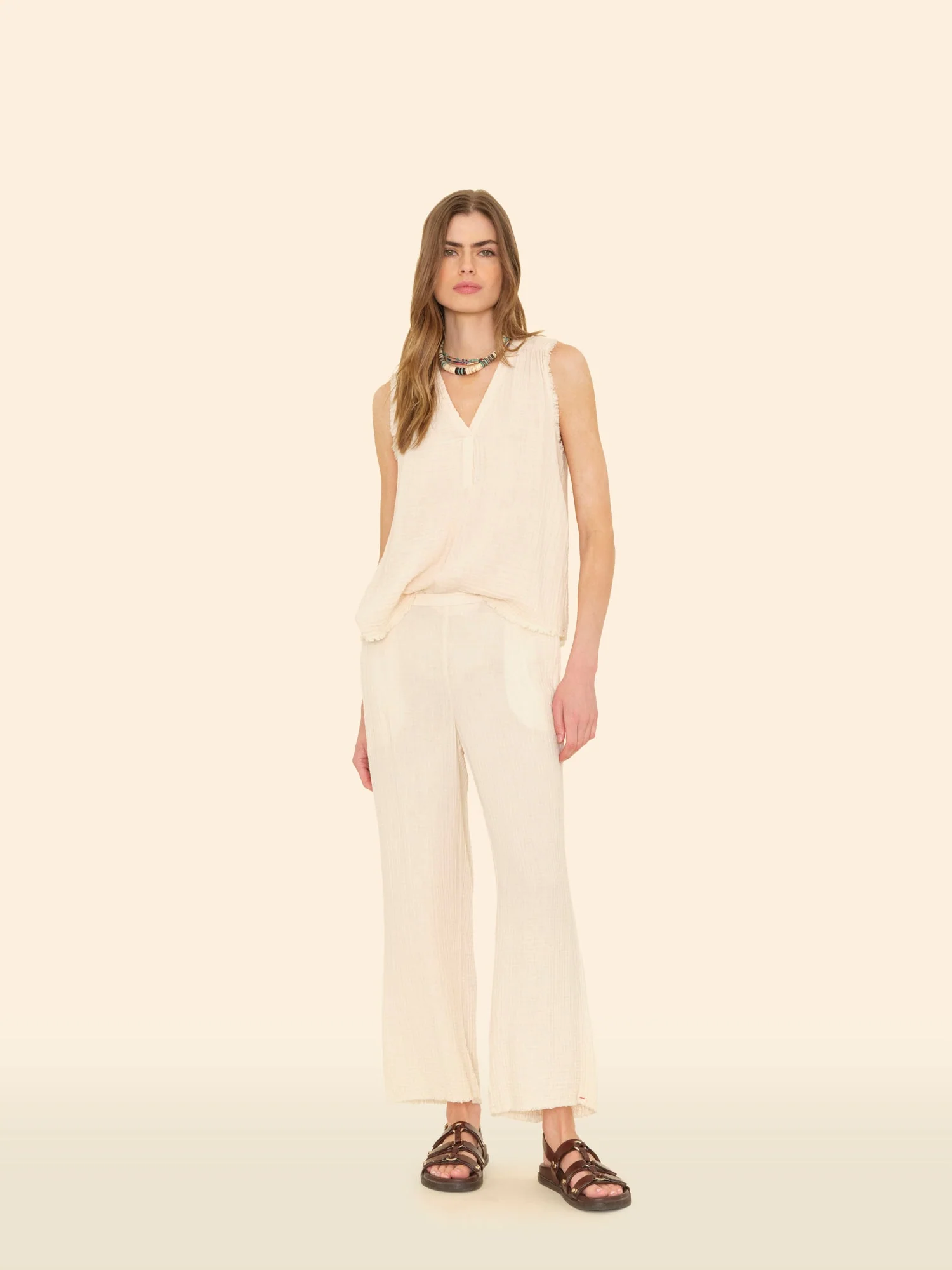 Sitting Pretty. Jayde is new this season in our washed double faced cotton gauze for a soft, gently crinkled feel. Jayde is a slightly cropped pull on pant with a flat front waistband and elasticized back, side seam pockets, and a raw edge hem.